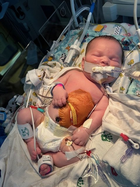 At 37 weeks, it was time to meet our beautiful baby boy. After 30 hours of labor, we decided it was time to deliver him via C-section. He was born and immediately intubated. Nathaniel seemed to do well for the first couple of days, but early on he was diagnosed with DORV (double outlet right ventricle), meaning he would need open-heart surgery to repair his ventricle.